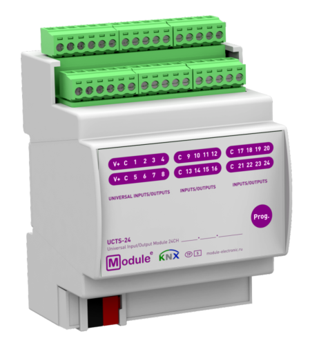 Гибридный модуль входов/выходов с функцией термоконтроля предназначен для преобразования входного воздействия (кнопка, выключатель, реле, выход датчика и т.п.) в управляющие телеграммы шины KNX и для отображения состояния телеграмм при помощи маломощных индикаторов (например, светодиода). Имеет возможность измерения температуры при помощи выносных датчиков и управления климатическими устройствами (актуаторы отопления, кондиционеры и т.п.).