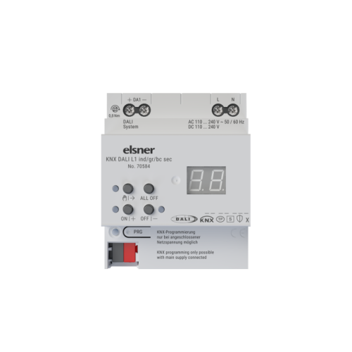 KNX L1 и L2 ind/gr/bc sec образуют интерфейс между установкой KNX и цифровой системой освещения DALI (Digital Addressable Lighting Interface). В зависимости от варианта устройства шлюз позволяет переключать и регулировать яркость управляющего устройства DALI либо в одной системе DALI (управляющее устройство L1, 1×64), либо в двух отдельных системах DALI (управляющее устройство L2, 2×64).