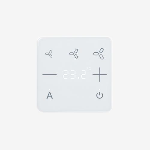 Контроллер комнатной температуры для системы шины здания KNX автоматически управляет кондиционированием воздуха с помощью фанкойлов. Он имеет сенсорные кнопки, с помощью которых можно вручную перенастраивать параметры климата в помещении. Можно задать скорость вращения вентилятора (1-3), заданную температуру (значение, сенсорные кнопки +/-) и режим (автоматическое включение/выключение, включение/выключение кондиционирования воздуха). Светодиоды показывают текущие настройки. Можно регулировать яркость и поведение светодиодов при выключении.<br />