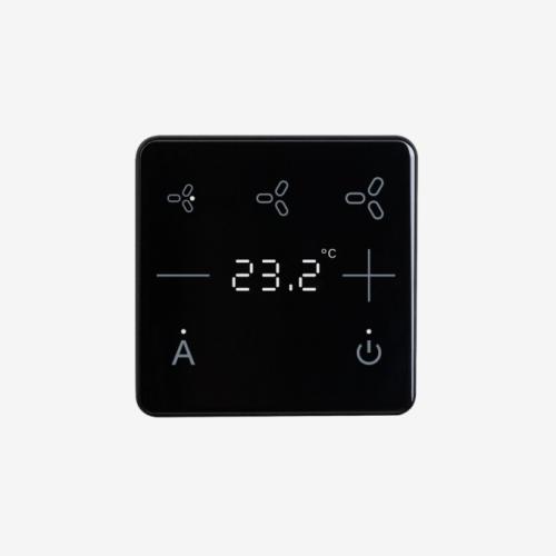 Контроллер комнатной температуры для системы шины здания KNX автоматически управляет кондиционированием воздуха с помощью фанкойлов. Он имеет сенсорные кнопки, с помощью которых можно вручную перенастраивать параметры климата в помещении. Можно задать скорость вращения вентилятора (1-3), заданную температуру (значение, сенсорные кнопки +/-) и режим (автоматическое включение/выключение, включение/выключение кондиционирования воздуха). Светодиоды показывают текущие настройки. Можно регулировать яркость и поведение светодиодов при выключении.<br />