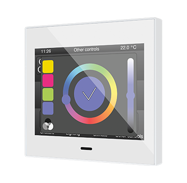 Емкостная сенсорная панель с подсветкой 3,5-дюймового дисплея, датчиком приближения, внутренним датчиком температуры, внутренним датчиком влажности и термостатами для двух независимых зон. Она может содержать до 56 элементов управления/индикаторов, распределенных на 7 страницах с навигационным меню. Заставка с датой, временем и/или температурой устанавливается, когда сенсорная панель не используется, и меню отображается автоматически при приближении пользователя благодаря датчику приближения. Ее яркость регулируется датчиком освещенности окружающей среды. Кроме того, она включает в себя 4 аналого-цифровых входа, которые могут быть настроены как двоичные входы для датчиков и беспотенциальных кнопок, как входы температурного датчика или как входы датчика движения. Она совместима с KNX Secure. Доступна в белом, антрацитовом , серебристом и шампанском цветах. Аксессуары: температурный датчик, датчик движения.