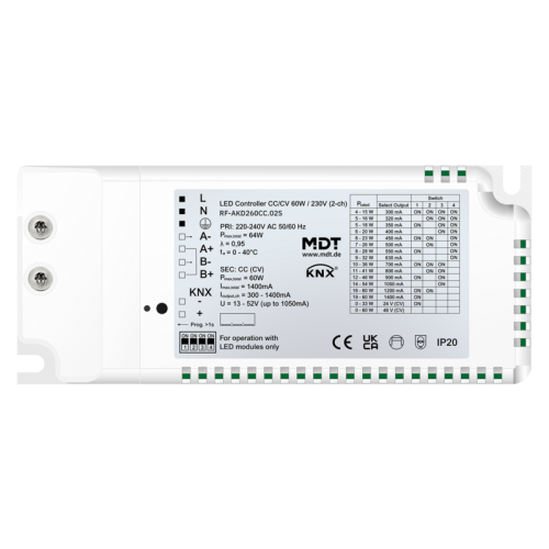 MDT LED Controller CC/CV 60 W — это компактный светодиодный контроллер со встроенным источником питания для постоянного тока (CC) и постоянного напряжения (CV). Два канала для подключения светодиодных прожекторов с общей мощностью 60 Вт. Возможны режимы работы «2x white» или «1x tunable white». Обширное применение KNX с динамическим управлением дневным светом (HCL), зависящим от времени затемнением и контролем перегрузки по току/температуре.