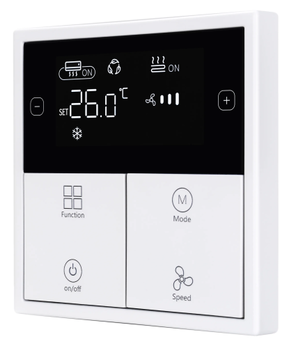 ■ Встроенные датчик температуры воздуха и датчик влажности ■ Встроенный датчик приближения, при обнаружении человеческого тела, можно активировать подсветку ЖК дисплея и кнопок ■ Регулируемая яркость подсветки ЖК дисплея ■ Отдельные страницы управления кондиционером, теплым полом и системой вентиляции, каждая может использоваться для управления одним каналом устройств ■ Значки и текст на панели поддерживают лазерную гравировку