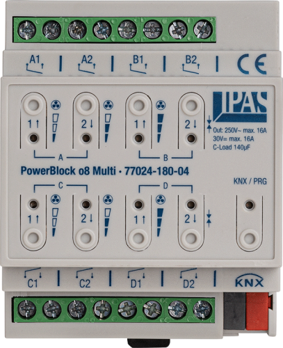 PowerBlock o8 Multi — это исполнительный механизм с 8 выходными реле, с помощью которых можно коммутировать нагрузки 16 А (<140 мкФ). Эти релейные выходы можно параметризовать в приложении ETS как стандартные двоичные выходы или как выходы для управления жалюзи или рольставнями. «Multi» означает универсальное подключение выходов.