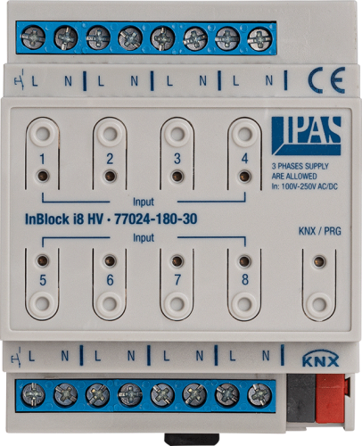 Исполнительный механизм InBlock i8 HV представляет собой модуль двоичных входов с 8 высоковольтными входами. Входы устойчивы к напряжению от 100 до 250 В переменного/постоянного тока.