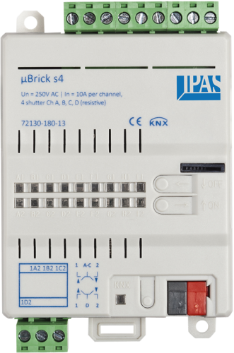 µBrick s4 — это исполнительный механизм с 4 выходными каналами (каналы A, B, C, D) для управления до 4 приводами жалюзи или рольставней. Каждый канал имеет 2 выхода для направления вверх/вниз, которые могут выдерживать максимальную резистивную нагрузку 10 А.