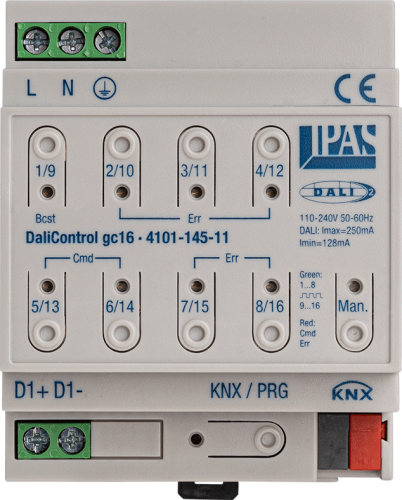 IPAS DaliControl gc16 сочетает в себе комплексные функции управления освещением и экономичность. Специально разработанный для широкого спектра применений, он позволяет управлять до 64 светильниками DALI в 16 группах или 64 отдельными ЭПРА. DaliControl gc16 сертифицирован как одноканальное ведущее устройство DALI-2.