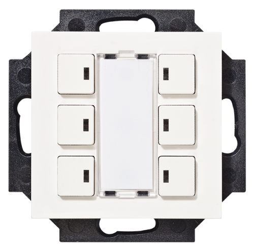 Piazza 6 RGB дополняет базовое устройство светодиодами состояния RGB, расположенными в элементах кнопок. Для типичных функций управления KNX, таких как переключение или диммирование, состояние объекта KNX может отображаться в обратной связи кнопки. Поле для маркировки может использоваться для описания функции кнопки и оснащено двумя светодиодами RGB-индикации ориентации вверху и внизу.