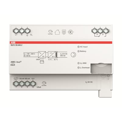 Источник бесперебойного питания 640 мА со встроенным дросселем для питания шины ABB i-bus® KNX, защищён от короткого замыкания и перегрузки. Светодиоды отображают ток шины, напряжение сети и напряжение аккумулятора. Широкий диапазон входного напряжения: 85–265 В переменного тока, 50/60 Гц. Источник питания может заряжать аккумуляторный модуль AM/S 12.1 или до двух аккумуляторов в нормальном режиме работы. В случае отключения электропитания напряжение шины обеспечивается аккумуляторами.