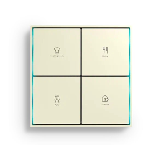 - 4-х клавишный выключатель имеет 8 независимых кнопок, поддерживает управление: освещением / шторами / сценариями. Управление так же доступно через кратковременные/длительные нажатия.