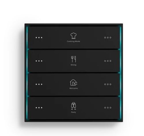 - 4-х клавишный выключатель имеет 8 независимых кнопок, поддерживает управление: освещением / шторами / сценариями. Управление так же доступно через кратковременные/длительные нажатия.