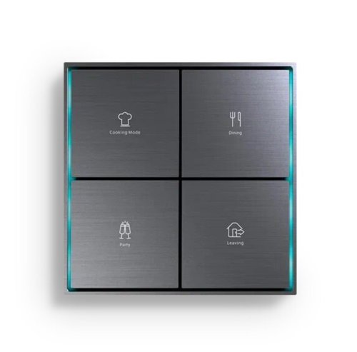 - 4-х клавишный выключатель имеет 8 независимых кнопок, поддерживает управление: освещением / шторами / сценариями. Управление так же доступно через кратковременные/длительные нажатия.