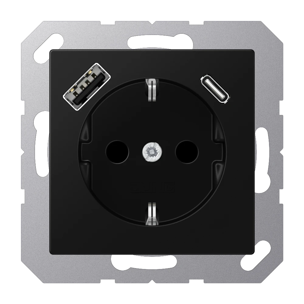 Jung A 1520-15 CA SWM SCHUKO®-розетка 16 A 250 В ~, with USB charger 1 x type A + 1 x type C, с дополнительной защитой,, Серия A, матовый чёрный графит