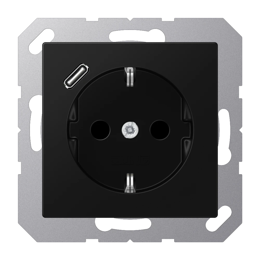 Jung A 1520-18 C SWM SCHUKO®-розетка 16 A 250 В ~, with USB charger 1 x type C, с дополнительной защитой,, Серия A, матовый чёрный графит