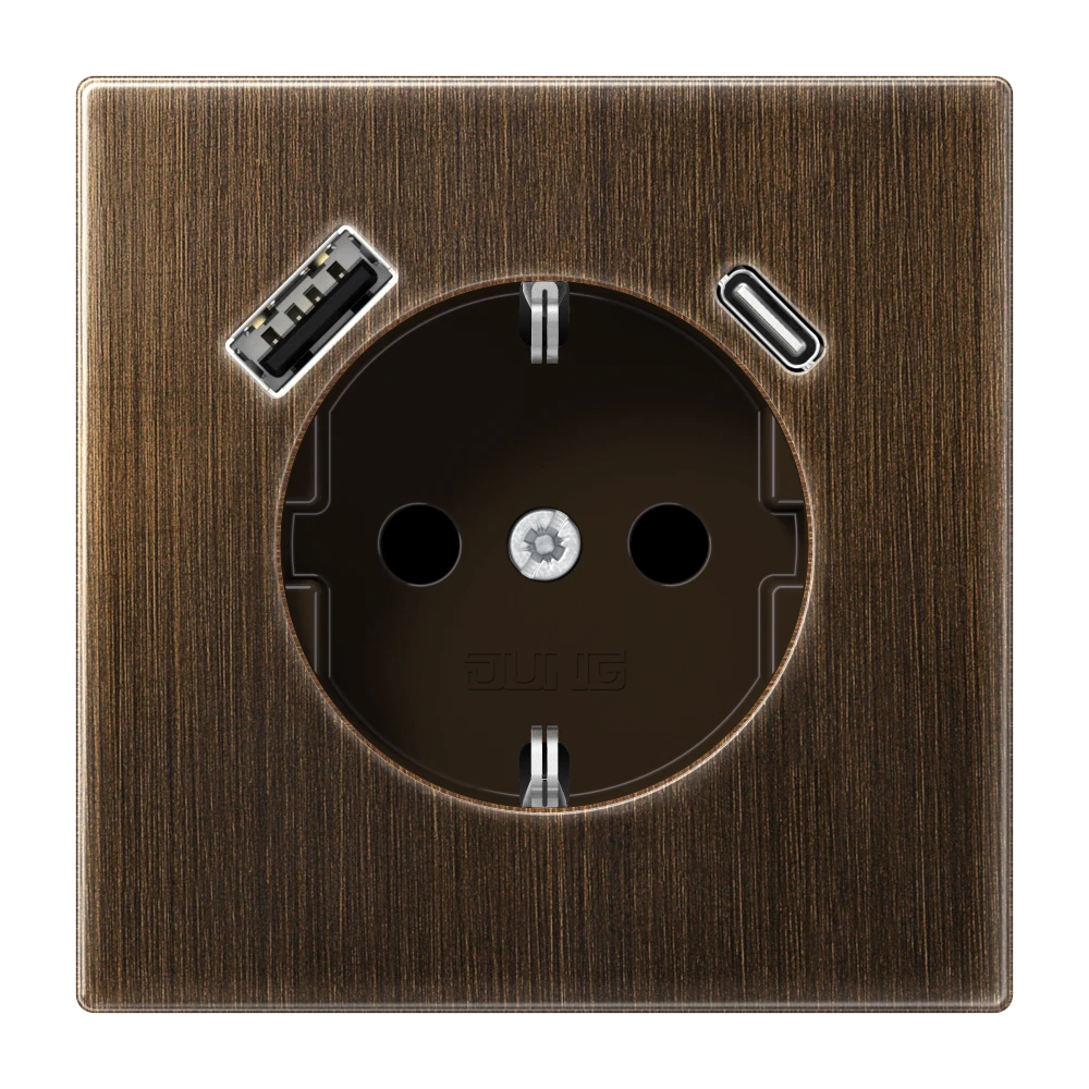 Jung ME 1520-15 CA AT SCHUKO®-розетка 16 A 250 В ~, с зарядным устройством USB 1 x тип A + 1 x тип C, с дополнительной защитой,, Серия LS, латунь Antik