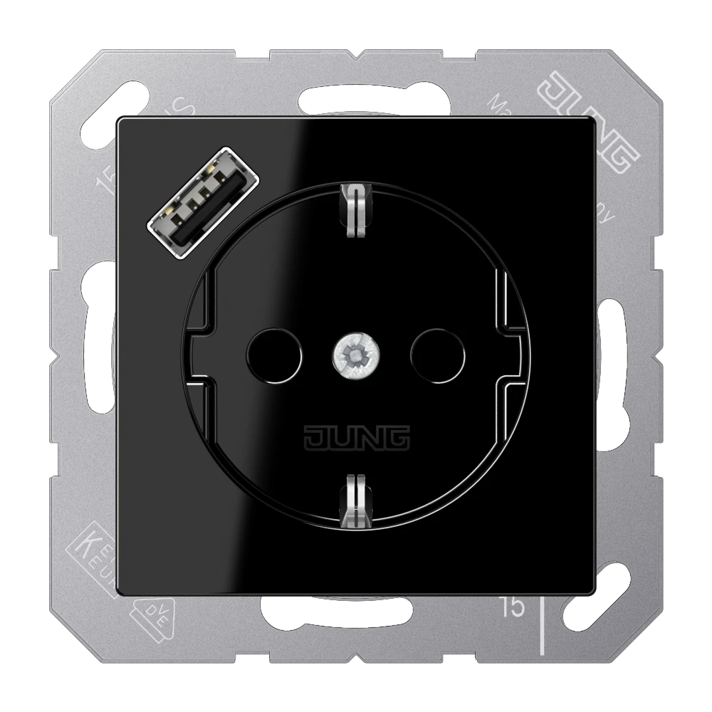 Jung A 1520-18 A SW SCHUKO®-розетка 16 A 250 В ~, with USB charger 1 x type A, с дополнительной защитой,, Серия A, чёрный