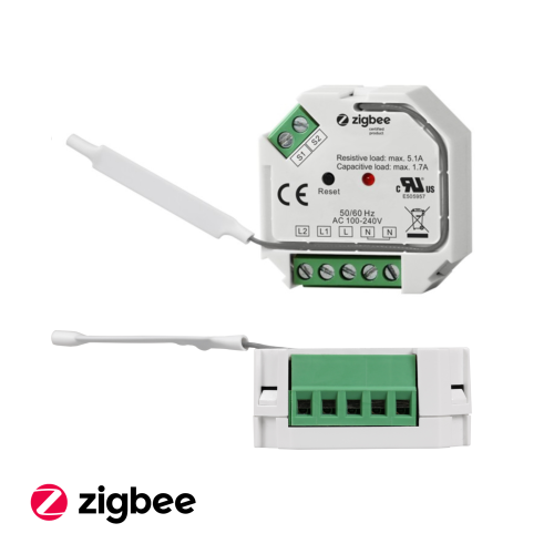 Inttechno Relay Module (2CH) — двухканальный релейный модуль 230В, предназначенный для установки в монтажную коробку за выключателем освещения. Работает по протоколу Zigbee 3.0 и позволяет управлять двумя группами освещения в режиме «включить-выключить» через подключённый выключатель, систему умного дома или мобильное приложение.