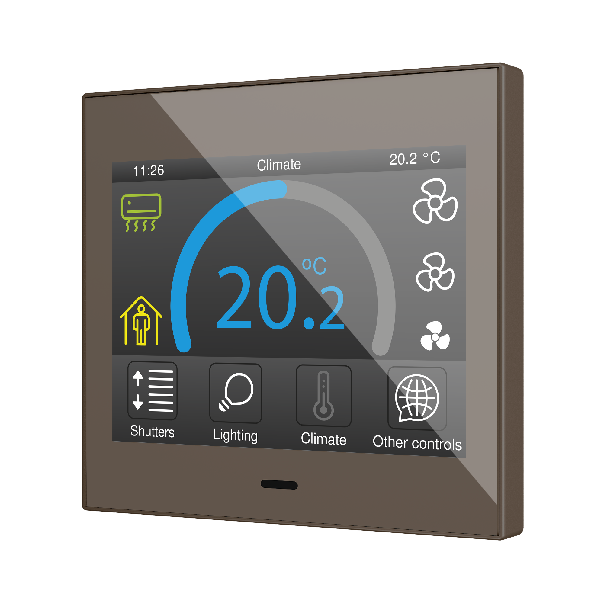 Емкостная сенсорная панель с подсветкой 3,5-дюймового дисплея, датчиком приближения, внутренним датчиком температуры, внутренним датчиком влажности и термостатами для двух независимых зон. Она может содержать до 56 элементов управления/индикаторов, распределенных на 7 страницах с навигационным меню. Заставка с датой, временем и/или температурой устанавливается, когда сенсорная панель не используется, и меню отображается автоматически при приближении пользователя благодаря датчику приближения. Ее яркость регулируется датчиком освещенности окружающей среды. Кроме того, она включает в себя 4 аналого-цифровых входа, которые могут быть настроены как двоичные входы для датчиков и беспотенциальных кнопок, как входы температурного датчика или как входы датчика движения. Она совместима с KNX Secure. Доступна в белом, антрацитовом , серебристом и шампанском цветах. Аксессуары: температурный датчик, датчик движения.
