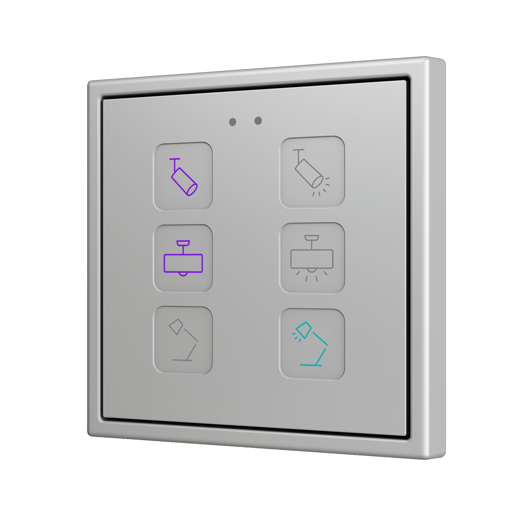 Сенсорные переключатели из поликарбоната с настраиваемыми значками, размером 70 x 70 мм, предназначены для использования с рамками 70 x 70 мм из серий Zennio и Jung LS. Доступны версии с 1, 2, 4 или 6 кнопками, все они работают с использованием одного и того же приложения, с настраиваемыми функциями и значками с RGB-подсветкой, яркость которых уменьшается, когда пользователь перестает обнаруживаться датчиком приближения. Tecla RGB 70 включает в себя встроенный температурный датчик и термостат, а также 2 аналого-цифровых входа, которые можно настроить как бинарные входы, датчики, кнопки, температурные датчики или датчики движения.Совместим с KNX Secure.