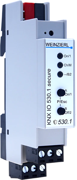 KNX IO 530.1 secure — это компактный диммер на 230 В с одним выходом для регулировки яркости и двумя бинарными входами .