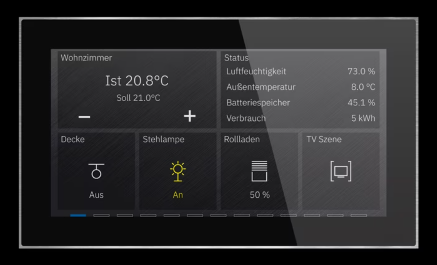 Сенсорная панель серии Eternity с 6" TFT дисплеем (1440 x 720 px). Виджеты для управления освещением, шторами, отоплением и другими функциями Умного дома. Возможность настройки до 64 объектов управления. Одновременное отображение до 12 значений активных параметров. Прямая интеграция в шину KNX. Совместимость с системами SIP-домофонии. Возможность отображения видеопотока с IP‑камер. Четыре варианта отделки: алюминий, затемненный алюминий, золото, медь. Размер панели: 92 x 160 x 12.5 мм.