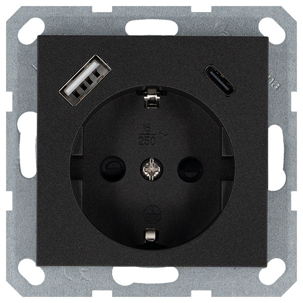 Jasmart Electric G5501USB-25B Розетка SCHUKO© с USB A+C с защитными шторками 16A 250V~ 2P+T USB 25W, цвет Антрацит, G5501USB-25B
