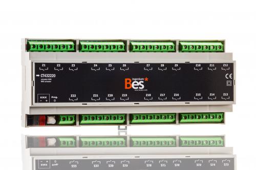 Вкл/выкл актуатор с 22 выходами, реле свободного напряжения с мощностью 16 А при 230 В на каждый выход. Многофункциональное программирование. Выходы работают одновременно или независимо в разных режимах (двоичные выходы, жалюзи, фанкойл и т.д.). Арифметико-логическое устройство. PARAM: программирование с помощью ETS.