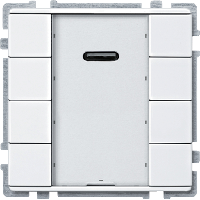 Со встроенным шинным соединителем. Кнопочный выключатель с 8 кнопками управления, индикатором рабочего состояния, 8 управляемыми по отдельности синими индикаторами и полем для надписи.