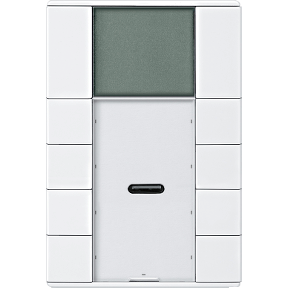 Дисплей с белой подсветкой для индикации времени, даты, температуры и режима работы. Меню для выбора стандартных режимов работы, уставки, рабочего/выходного дня (внешний запуск), режима отображения, установки текущего времени и времени включения, яркости дисплея. Клавиши программируются для работы в паре (в качестве 2-кнопочного выключателя) или индивидуально (в качестве 1-кнопочного выключателя).