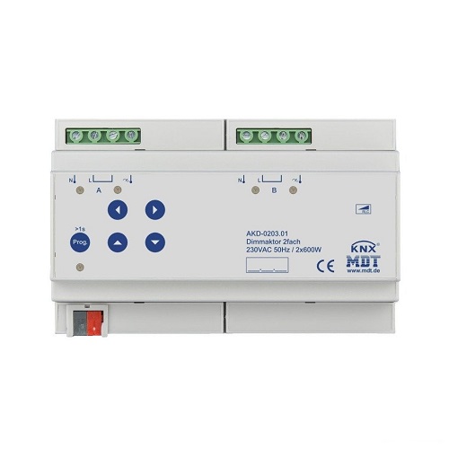 MDT AKD-0203.01 Универсальный диммер KNX/EIB, 2х канальный, нагрузка 2-600 Вт/ВА, выход 230В