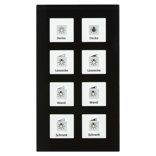 Сенсорный выключатель KNX/EIB 4х канальный (8 сенсорных зон), встроенный интерфейс KNX (BCU), двухцветная LED индикация, фоновая подсветка, 92 x 163 мм, стекло, цвет черный.