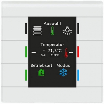 Модуль центрального управления KNX, цветной ЖК дисплей, 6 сенсорных зон, функция термостата (PI/PWM/2P), контроль порог. значений, расписания, текстовые сообщения, до 20 функций меню, белое стекло, в установочную коробку, 92x92x28 мм, IP20.
