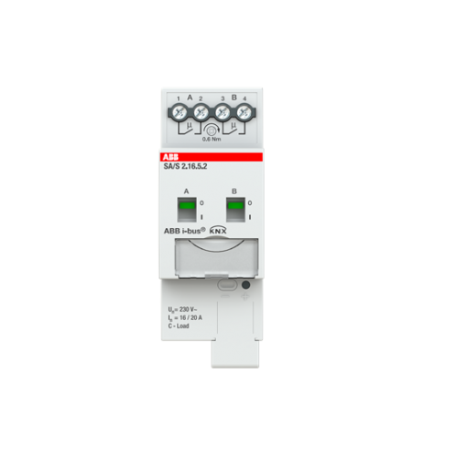 Привод переключателя использует беспотенциальные контакты для переключения 2 независимых электрических нагрузок через ABB i-bus® KNX. Устройство имеет ручное управление и отображение состояния переключения выходов. Устройство 16/20 A, 16 A-AC3 (нагрузка C) особенно подходит для нагрузок с большими импульсными токами, например, для флуоресцентного освещения в соотв. EN 60669.