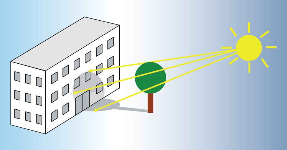 Также должен быть установлен локальный выключатель для ручного управления. Например, зимой жильцы могут желать, чтобы прямые солнечные лучи попадали в здание с целью его нагрева. Если другие здания или объекты, например деревья, расположены перед фасадом, они становятся источником тени. Их стоит учесть в расчетах, введя соответствующие данные (расстояние и размер). Рассчитывается траектория отбрасываемой тени, а также точный временной период, в течение которого окно закрывает тень от близстоящих деревьев.