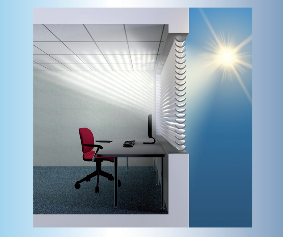 Перенаправление дневного света защищает от прямых, ослепительных солнечных лучей. Естественная яркость оптимально используется путем выборочного направления солнечного света в помещение. Целью такого подхода является контролируемый приток солнечного света в комнату. Солнечный свет направляется на потолок путем отслеживания угла поворота ламелей, где он освещает комнату через косвенное, но естественное освещение.