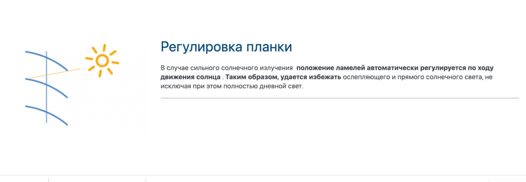 Высота и положение ламелей автоматически регулируются для отслеживания положения солнца. Для реализации полного спектра функций требуются жалюзи с ламелями. Однако данный функционал может быть реализован и в домах с рольставнями.