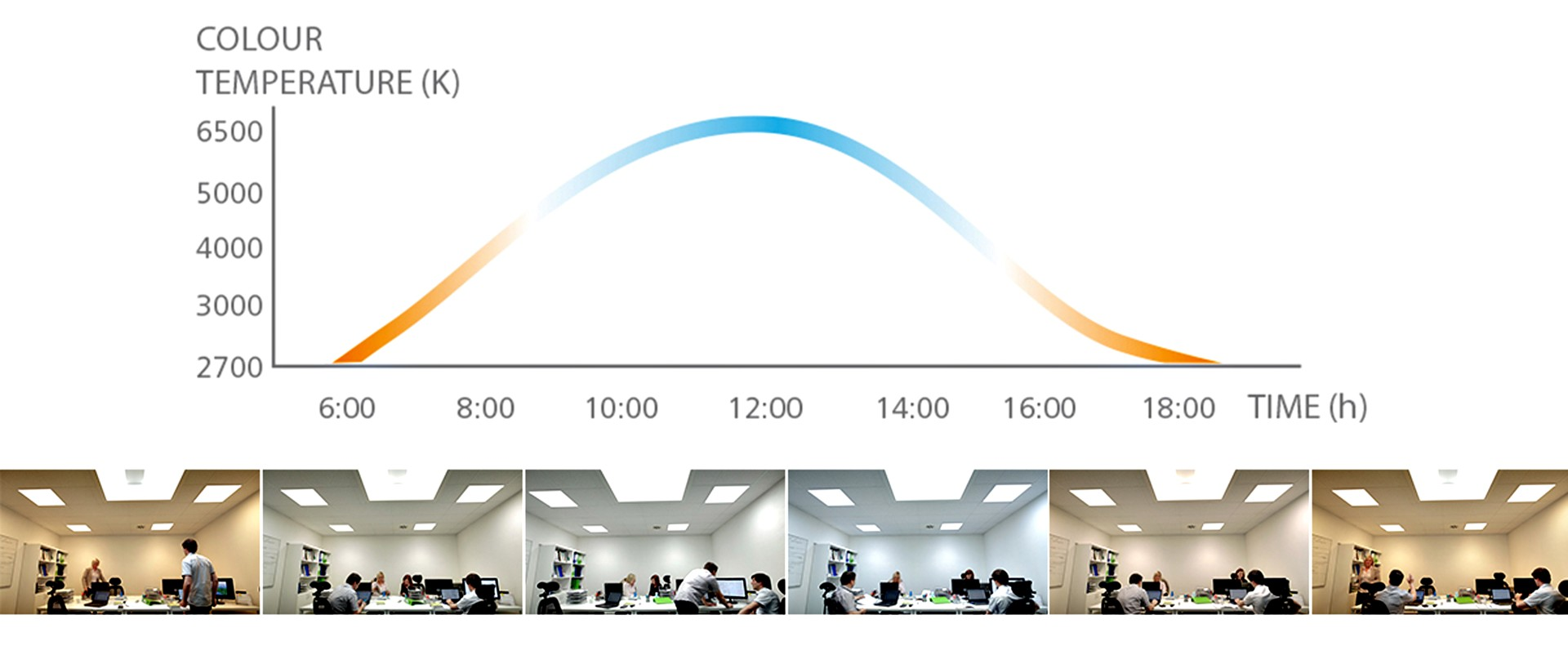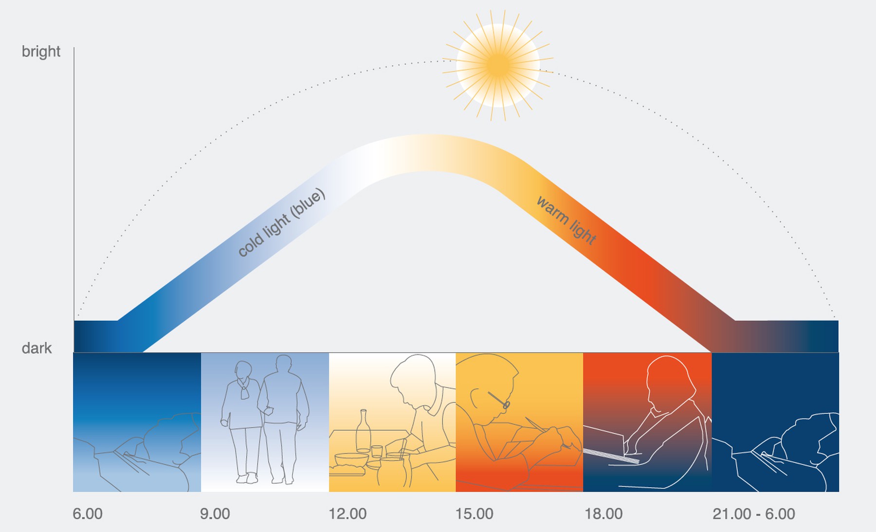 Естественное освещение также меняет свою интенсивность и цветовую температуру в течение дня, что также влияет на наше самочувствие и активность. Биодинамическое освещение помогает имитировать такие изменения внутри помещения.