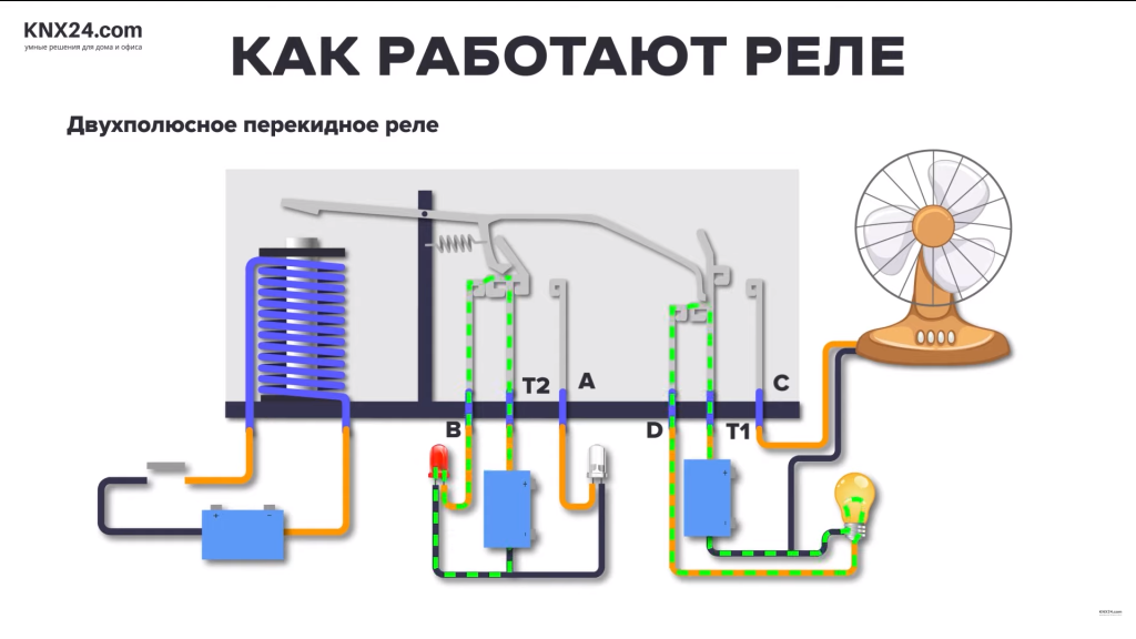 Двухполюсное перекидное реле используется для управления двумя состояниями в двух отдельных цепях. Здесь мы можем видеть такое реле. Когда первичная цепь не замкнута клеммы Т1 и Т2 подключены к клеммам Б и Д соответственно. Красный светодиод и световой индикатор находятся под напряжением. Когда первичная цепь замкнута, то Т1 и Т2 подключаются к клеммам А и С - вентилятор включается и зеленый светодиод находится под напряжением.