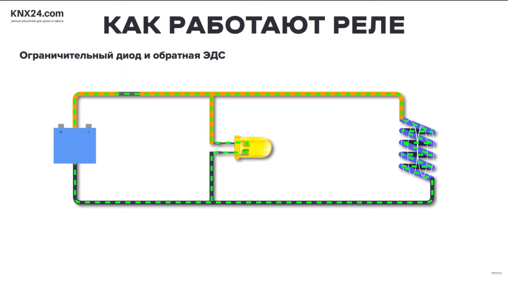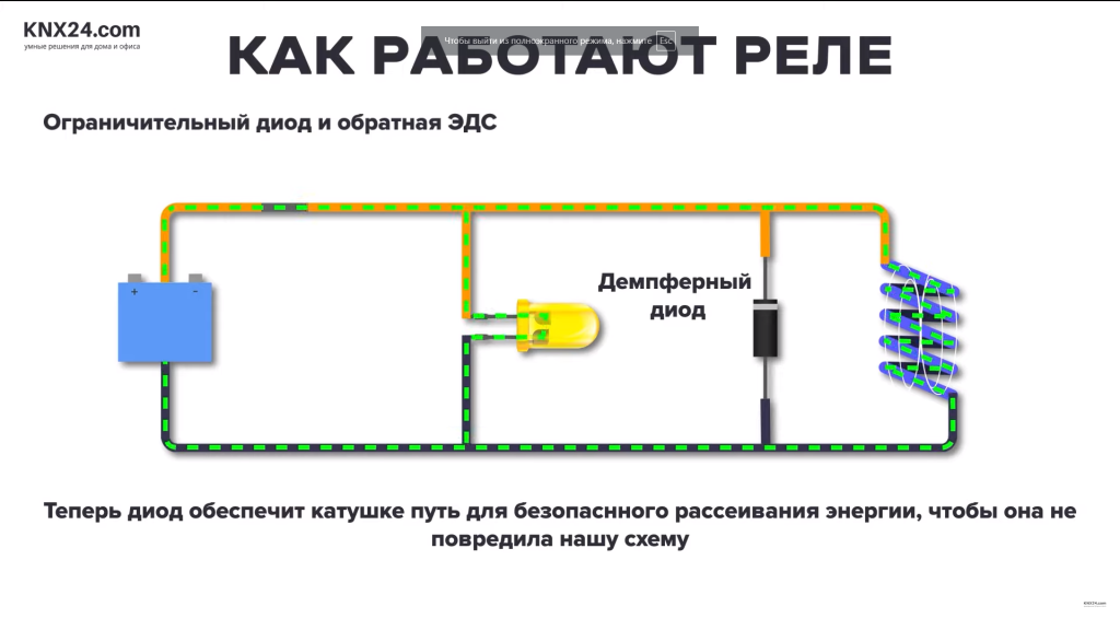 Поэтому при нормальной работе ток поступает на катушку, но, когда мы отключаем питание, обратная ЭДС будет толкать электроны и поэтому теперь диод обеспечит путь для безопасного рассеивания энергии, чтобы она не повредила нашу схему.