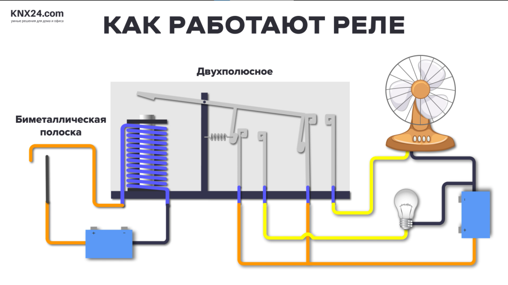 Мы могли бы, например, применить двухполюсное реле для управления охлаждающим вентилятором, а также сигнальной лампой. Вентилятор и лампа обычно выключены, но когда биметаллическая полоса на первичной цепи достаточно сильно нагревается, она изгибается, чтобы замкнуть цепь. Это создает электромагнитное поле и замыкает оба контакта на вторичной стороне. Это обеспечивает питание охлаждающего вентилятора, а также сигнальной лампы. Когда мы имеем дело с реле, то часто обращаем внимание входов, называемых полюсами, и выходов, называемых направлениями.