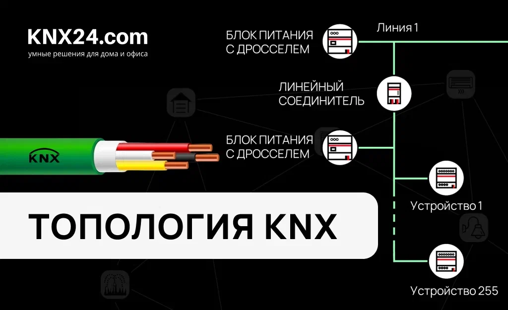 Базовым элементом структуры системы KNX TP является линия, в которой может быть до 256 устройств, включая сенсоры, актуаторы и как минимум один источник питания. Линия может иметь топологию “шлейф”, “звезда” или “дерево”. Используя разные комбинации вариантов соединения устройств можно оптимизировать расход кабеля ещё на этапе проектирования, а также упростить монтаж, применяя стандартные клеммы KNX.