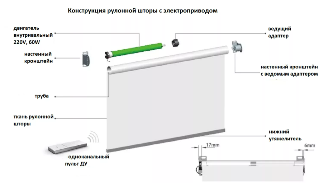 Конструкция рулонных штор иная: ткань шторы накручивается «рулоном» на вал, закреплённый на стене кронштейнами. В таком случае, электропривод устанавливается внутри вала и вращает его.