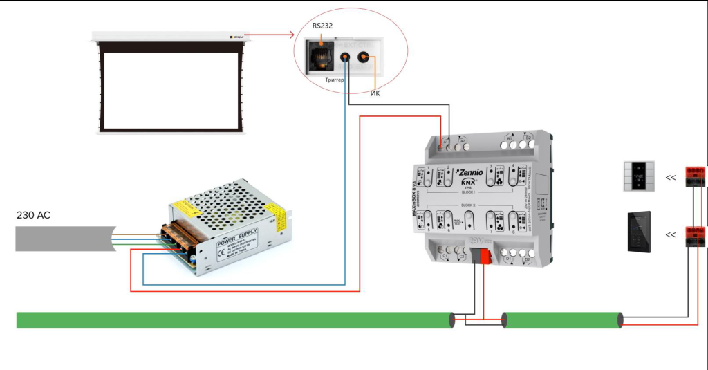 Также, можно настроить автоматическое опускание экрана при включении проектора через 12В триггерный вход. Этот способ можно реализовать и в системе умный дом с помощью контроллера.