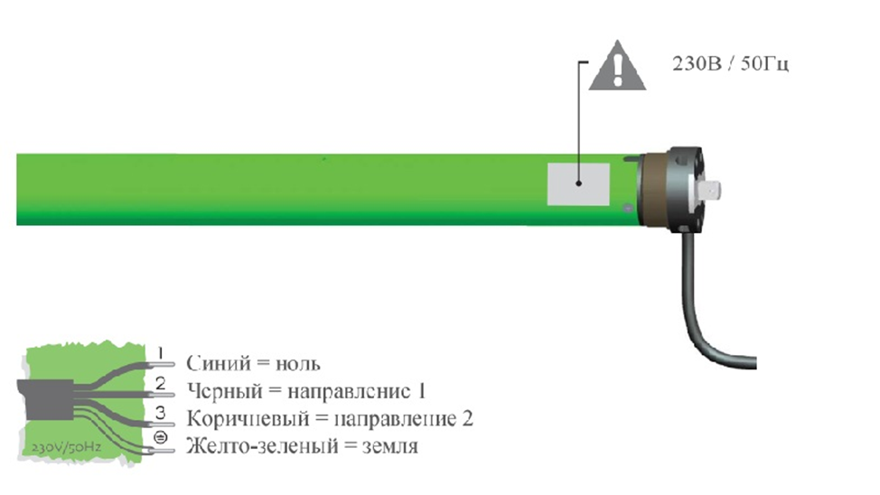 Поворот вала в сторону закрытия, или же открытия осуществляется во время подачи на контакты фазы 230 вольт. Движение шторы автоматически останавливается при достижении крайнего верхнего (открытие) или же крайнего нижнего (закрытие) значения, независимо от сигнала управления.