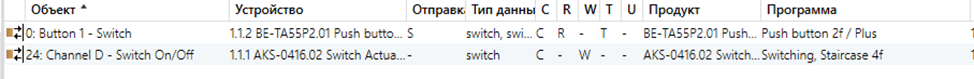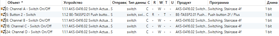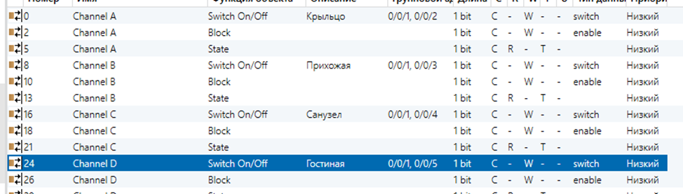 • Группа 0/0/5, управляющая светом в гостиной и использующая канал D.А вот как всё это выглядит в ETS: