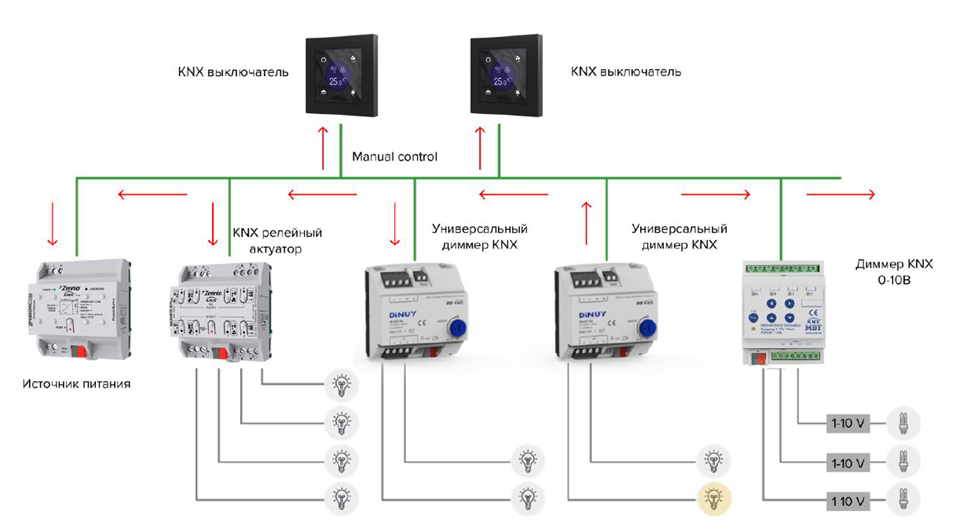 Для поклонников традиционной электроустановки имеется возможность применить обычные выключатели вместо стандартных KNX-модулей. При этом команды будут передаваться на шину, через модули бинарных входов, которые могут быть расположены за самим выключателем в монтажной коробке, либо на DIN-рейке в щите.