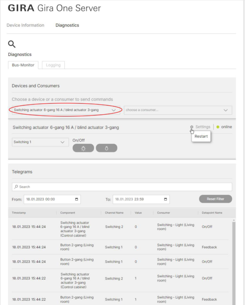 • Отслеживание телеграмм, отправляемых устройствами Gira One на шину.